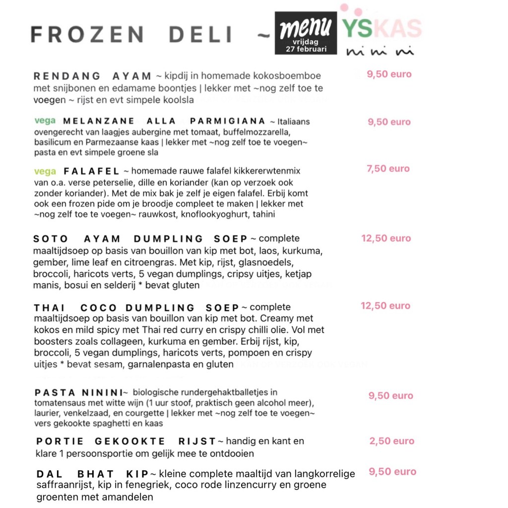 Meld je aan voor de wekelijkse menu update in je inbox via yskasninini@gmail.com